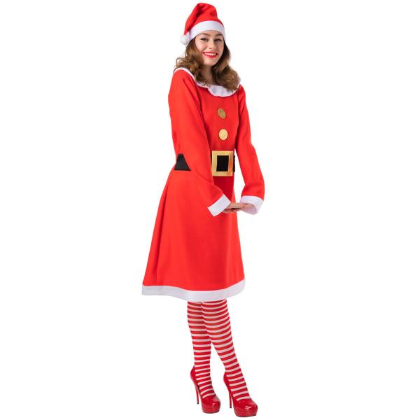 Mrs Santa Claus Dräkt omfattar en röd klänning i mjukt filttyg med en vit krage, vit kant nedtill, ett svart band framtill med ett guldspänne i tyg och två vita prickar på bröstkorgen. Det ingår även en klassisk tomteluva.