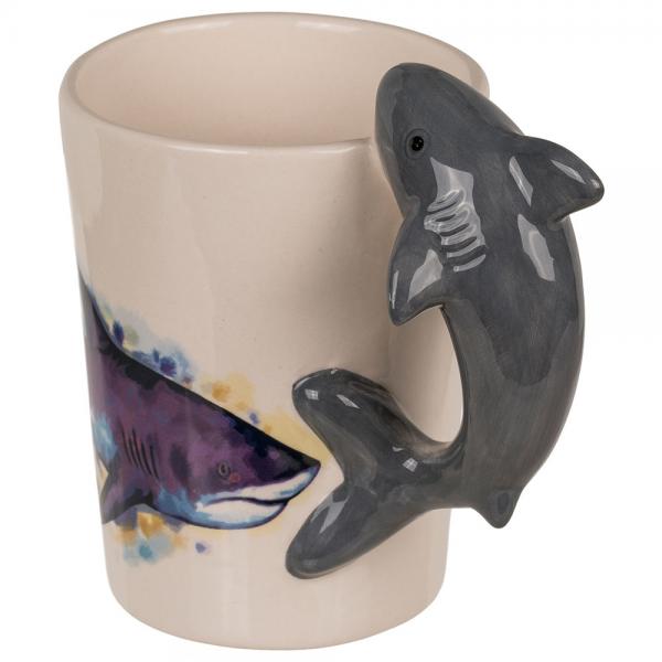 Mugg Haj är en vit stengodsmugg med ett fint hajmotiv samt ett handtag i form av en blå haj.