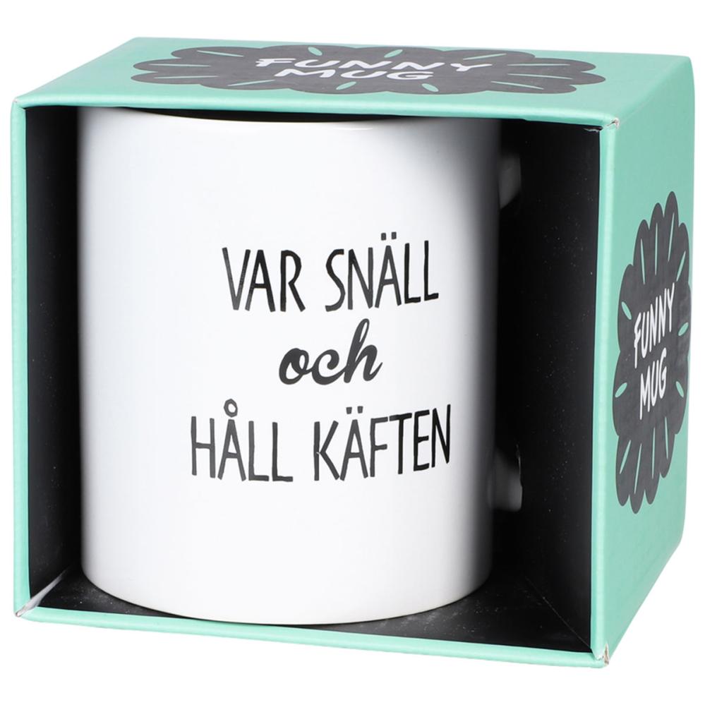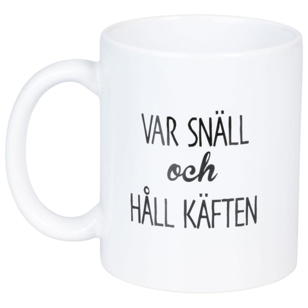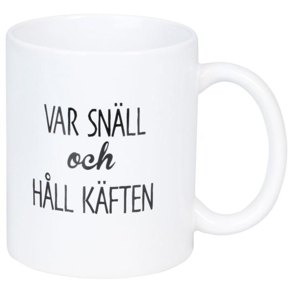 Mugg Var Snäll och Håll Käften 300 ml är en vit porslinsmugg med en svart text tryckt på båda sidor som säger "VAR SNÄLL och HÅLL KÄFTEN".