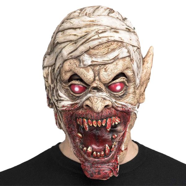 Skräckinjagande mumie mask som garanterar en riktigt skrämmande utklädnad! De röda ögonen, den blodiga munnen och de slitna bandagen skapar en riktigt kuslig stämning och skrämmer slag på så gott som vem som helst. Bär denna latexmask tillsammans med en passande mumie dräkt för en komplett maskerad utklädnad till halloween firandet. Superläskig halloweenmask som utan tvekan gör dig till den otäckaste mumien på hela festen!