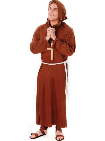 Munk dräkt inkluderar en lång brun munkrock med huva samt ett vitt repbälte. Storlekar: Vuxenstorlek.