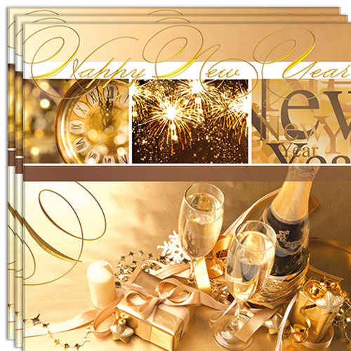 Nyårsservetter omfattar gyllene servetter med motiv av champagneglas, en champagneflaska, fyrverkerier samt texten "Happy New Year".
