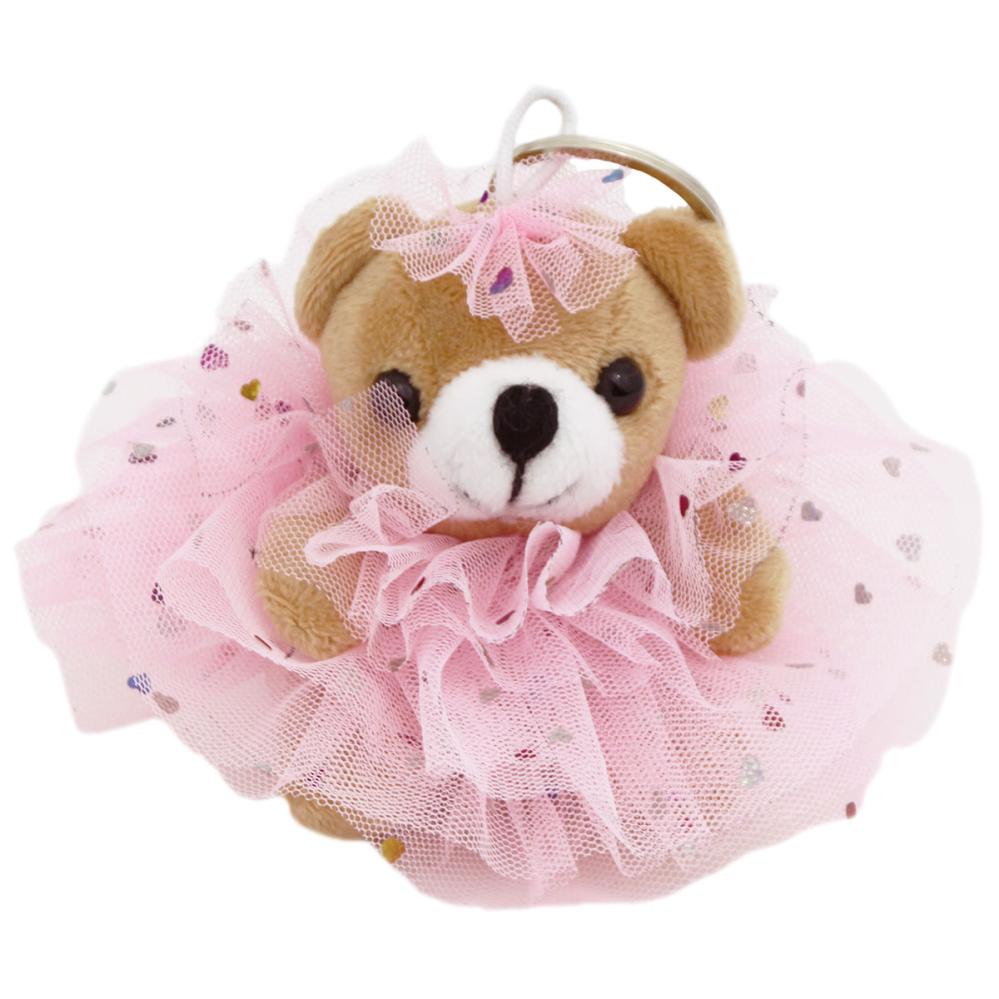 Nyckelring Björn med Rosa Kjol 9 cm omfattar en nyckelring med en liten ljusbrun och vit björn som bär en rosa tyllkjol prydd med små glittrande paljetthjärtan.