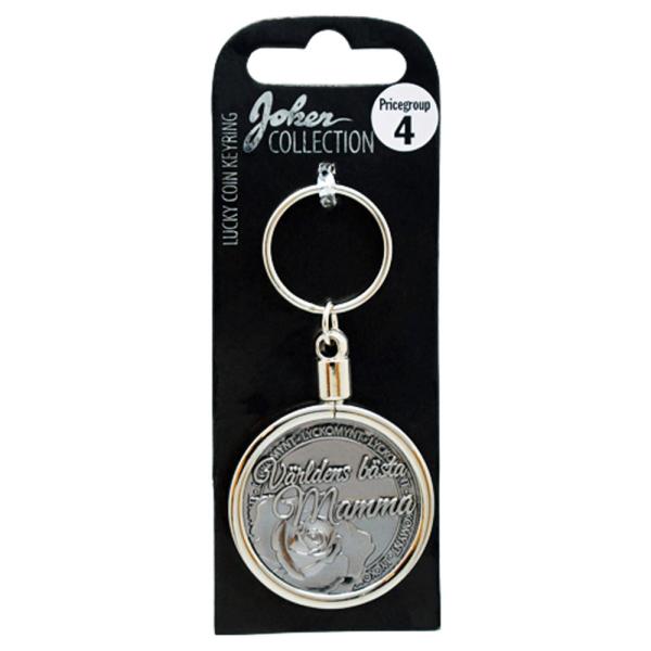 Nyckelring med Lyckomynt Världens Bästa Mamma omfattar en silvrig nyckelring i form av ett lyckomynt med texten ``Världens bästa mamma´´ på framsidan och ``Att ha en mamma som dig är lycka. Älskar dig!´´ på baksidan.