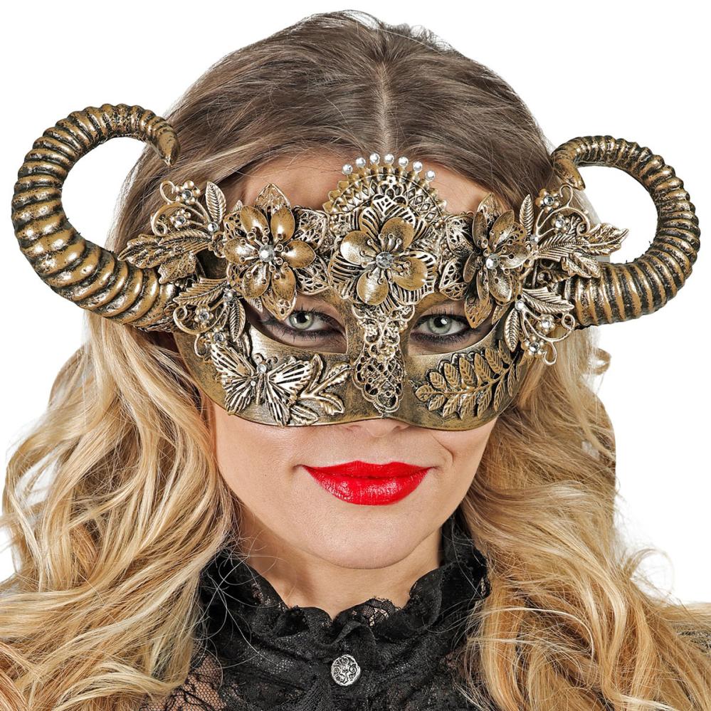 Ögonmask med Bagghorn är en mask i svart och guld, dekorerad med plastjuveler, en fjäril, blommor och andra växter. Masken har två bagghorn och hålls på plats med ett elastiskt svart band.