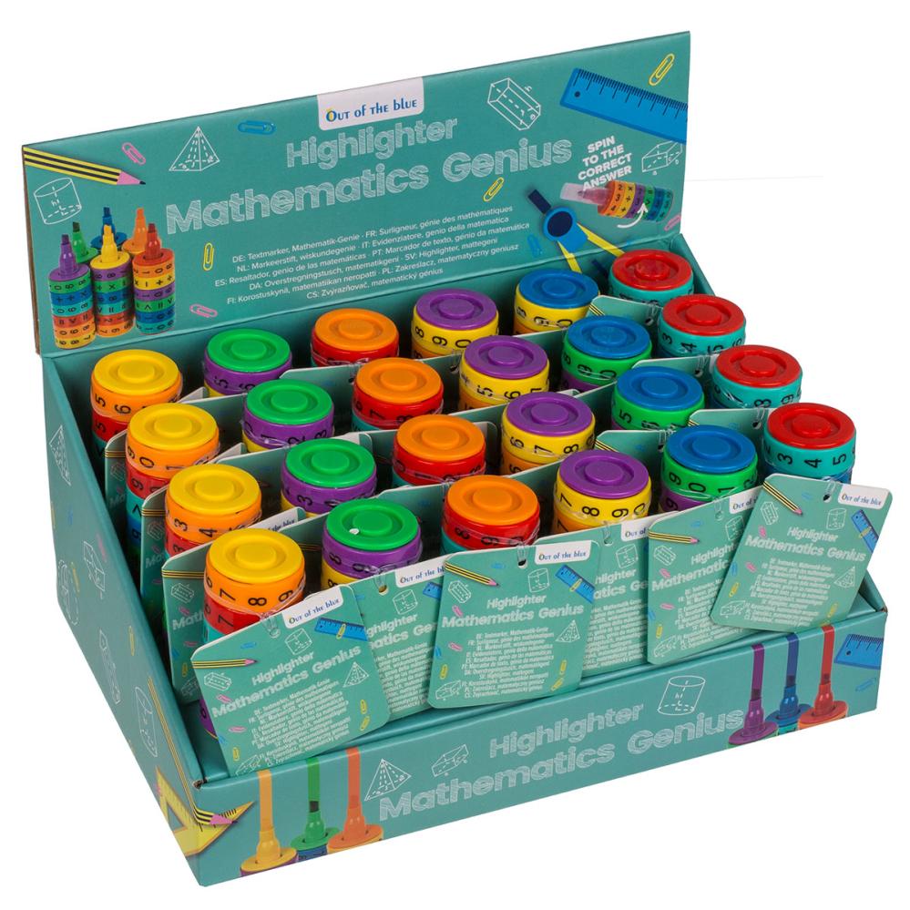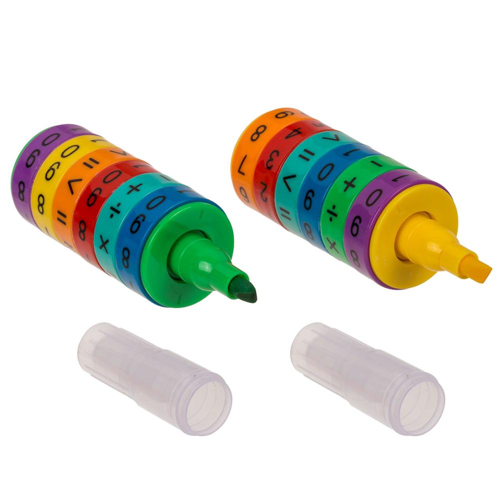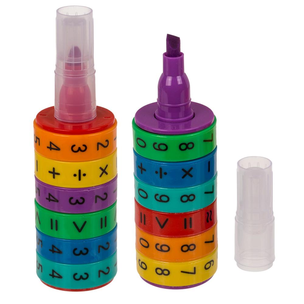Överstrykningspenna Matematik 3 x 10,5 cm är en överstrykningspenna som, förutom den klassiska textmarkeringsfunktionen, har sex roterande hjul med siffror, matematiska symboler och resultat. Den finns i sex olika färger: röd, orange, grön, lila, gul och blå.