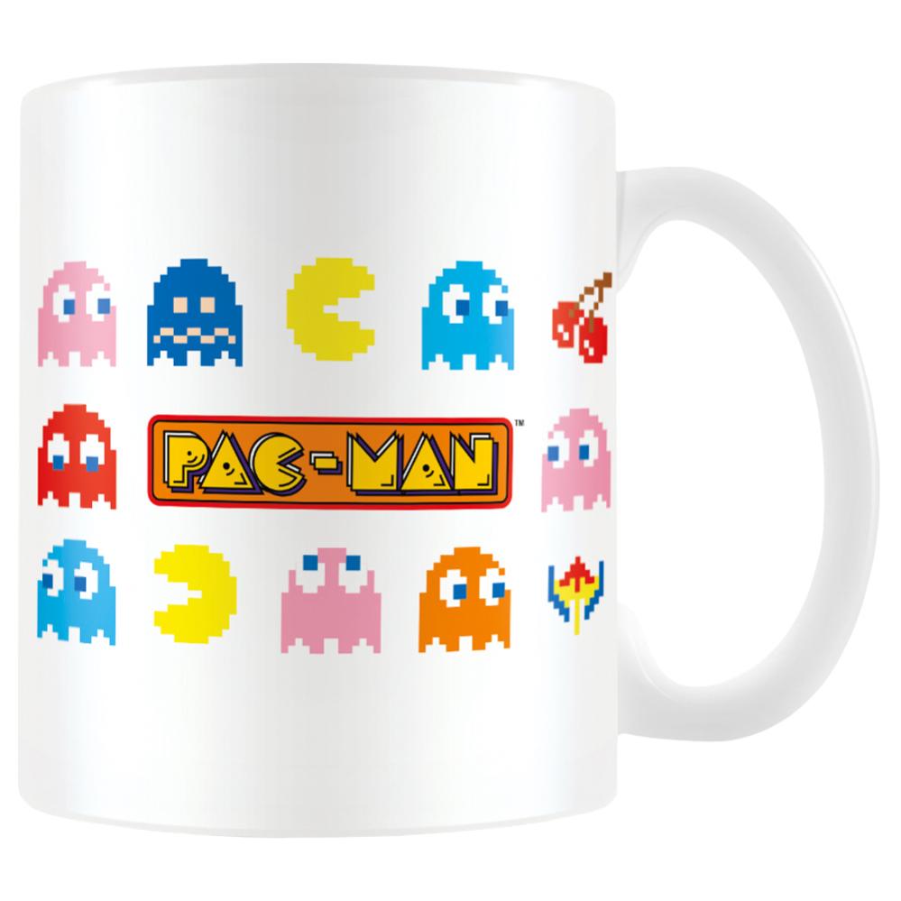 Pac Man Mugg omfattar en keramikmugg med handtag i vitt med Pac Man motiv och text i olika färger. Muggen rymmer 315 ml.