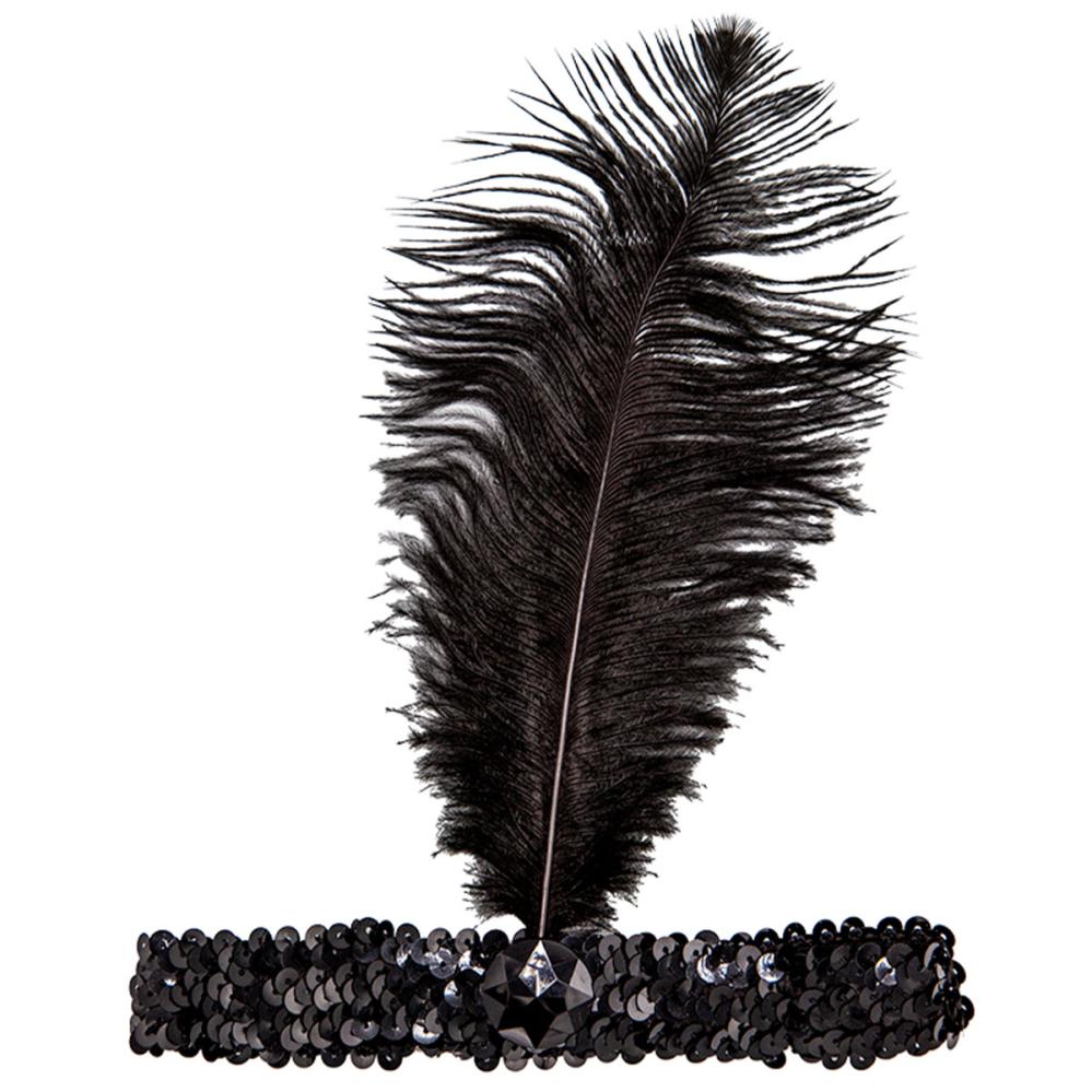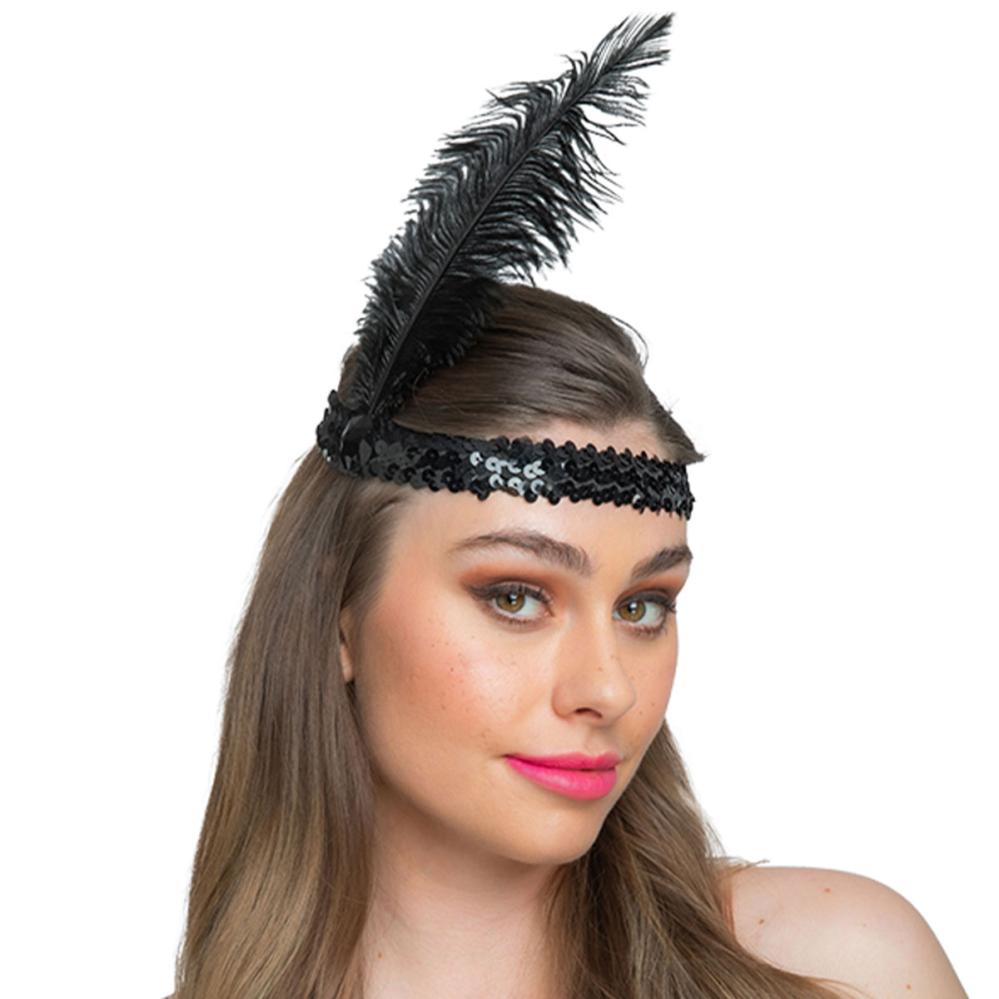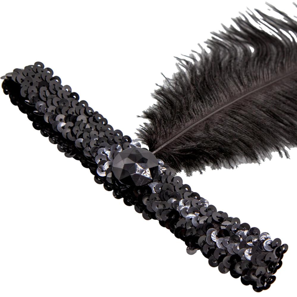Paljett Pannband med Fjäder Svart är ett svart pannband med paljetter och en stor fjäder.