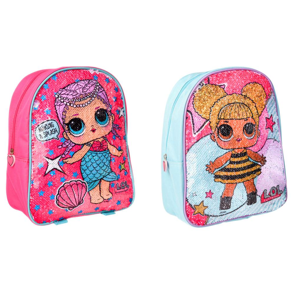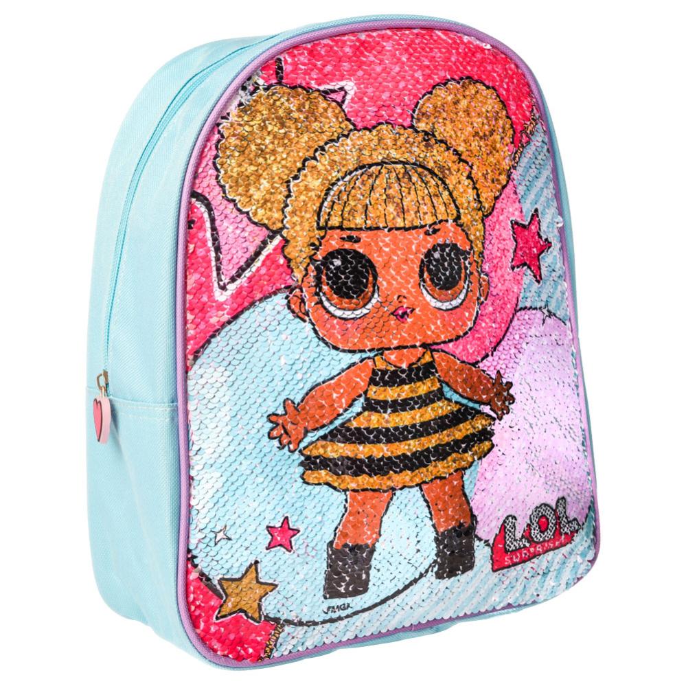 Paljetterad Lol Surprise Ryggsäck omfattar en ryggsäck av polyester med vändbara paljetter med två olika Lol Surprise motiv på framsidan. Ryggsäcken mäter 30 x 26 x 11 cm och har en dragkedja samt justerbara axelremmar. Ryggsäcken finns i mörkrosa och ljusblått med olika motiv, vilken färg och motiv du får slumpas.