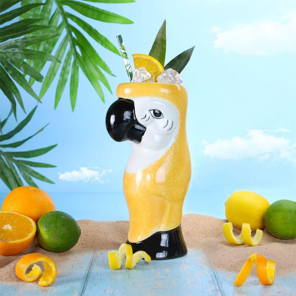 Papegoja Keramikmugg Gul 55 cl omfattar en keramikmugg i form av en gul papegoja för cocktails.