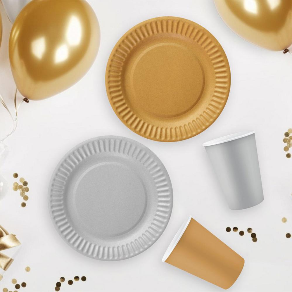 Färgen lyfter en juldukning där silver skapar lugn elegans. För dukning inför nyår passar papperstallrikar i silver utmärkt till varje fest och gör bordet enhetligt. Dessa engångstallrikar i silver sparar disk och håller formen under måltiden.