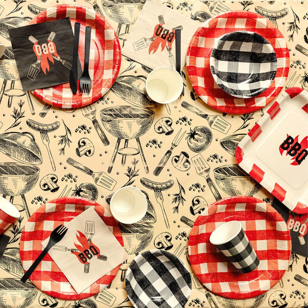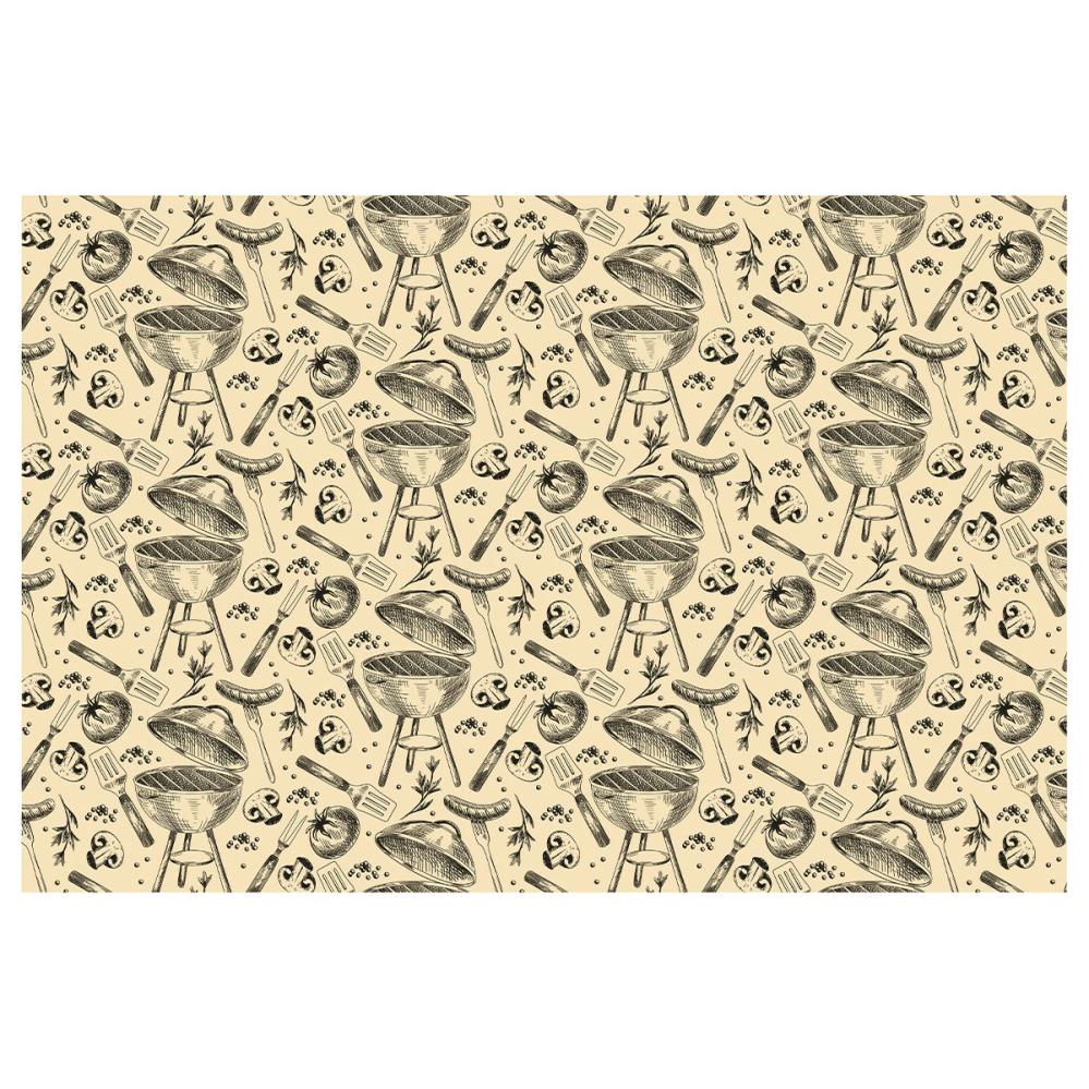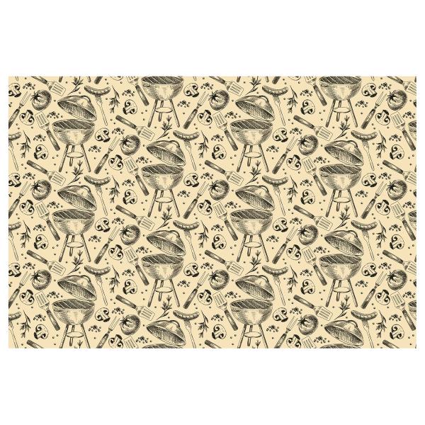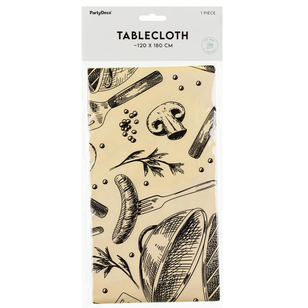Pappersduk Grill 120 x 180 cm består av en beige pappersduk med svart grillmotiv av klotgrillar, grillbestick och grillrelaterade råvaror.
