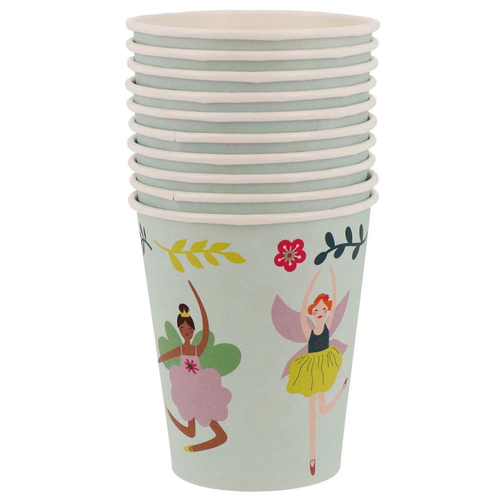 Pappersmuggar Fabulous Fairy 10-pack innehåller tio salviagröna engångsmuggar dekorerade med färgglada blommor och dansande älvor i ballerinakläder.