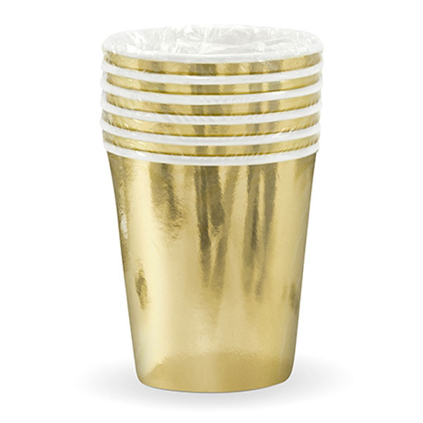 Pappersmuggar Guld Metallic innefattar 6 stycken muggar i guld, tillverkade i pappersmaterial. Endast för kalla drycker.