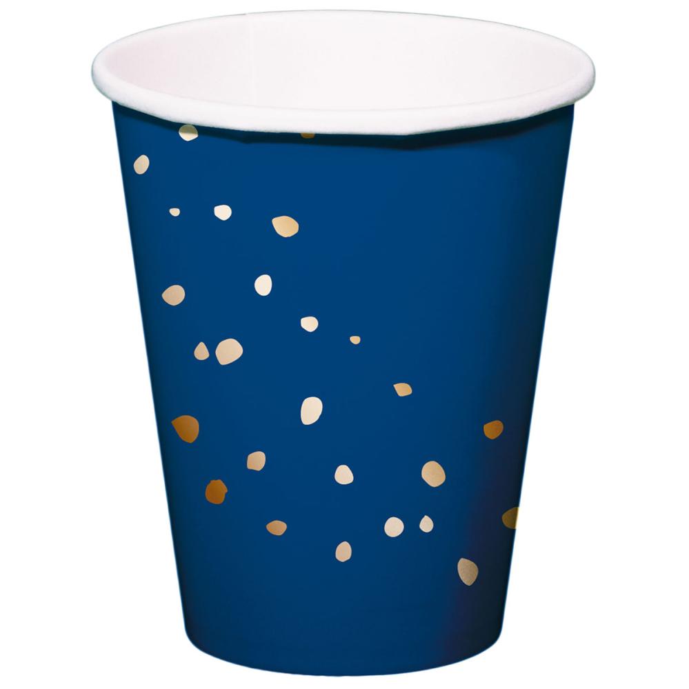 Pappersmuggar med Prickar Blå 8-pack innehåller åtta engångsmuggar i blått med guldfärgade prickar.
