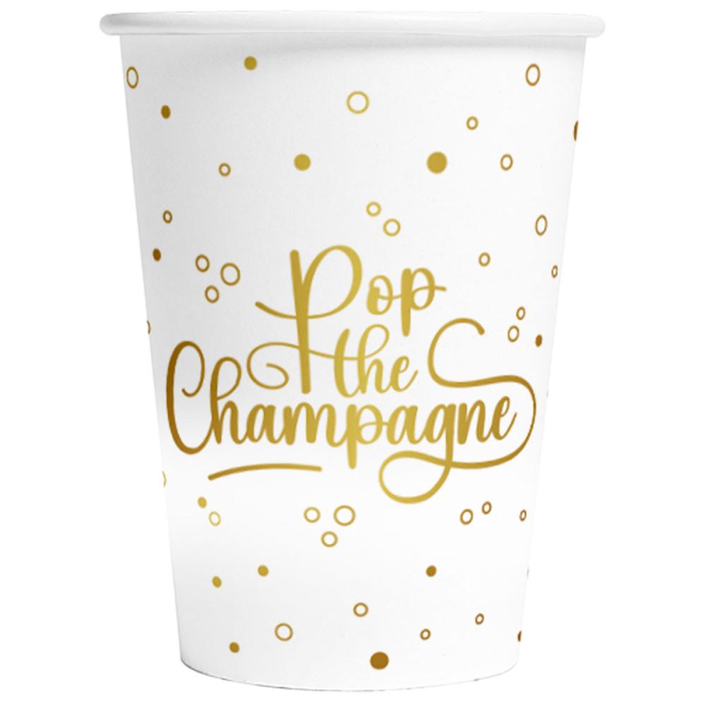 Pappersmuggar Pop the Champagne 8-pack består av åtta stycken vita pappersmuggar som har motiv av champagnebubblor och texten "Pop the Champagne" i en dov guldton.