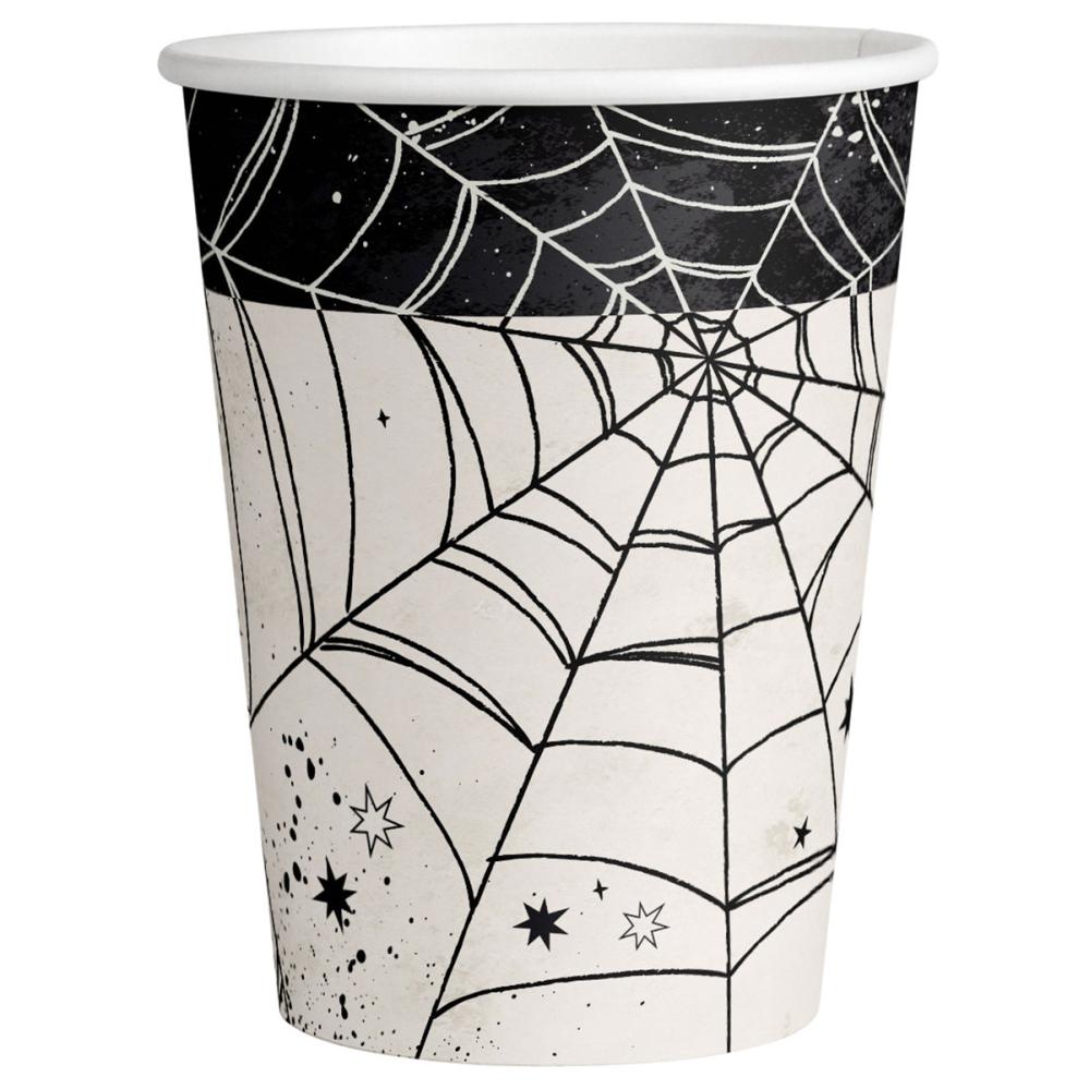 Pappersmuggar Spindelnät 8-pack innehåller 8 st pappersmuggar med ett svartvitt motiv av spindelnät, stjärnor och blodstänk.