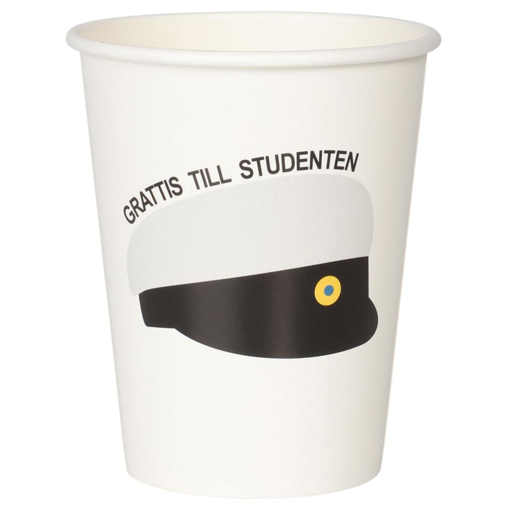 Pappersmuggar Studentmössa 25 cl 8-pack innehåller åtta vita pappersmuggar, dekorerade med texten "GRATTIS TILL STUDENTEN" i svart samt en klassisk studentmössa.