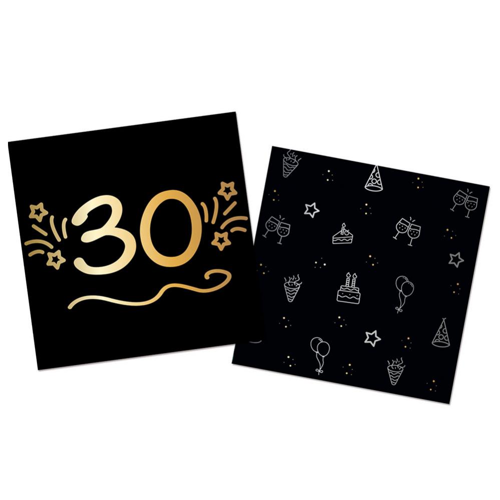Pappersservetter Svart 30 år 16-pack består av sexton svarta engångsservetter med tre lager. Varje servett är dekorerad med siffran 30, prickar och stjärnor i guldfärg samt tårtor, stjärnor, partyhattar och dricksglas i silverfärg.