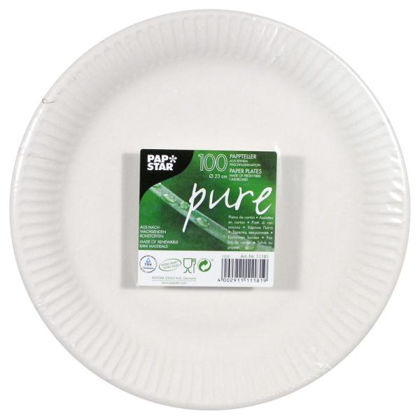 Papperstallrikar 100-pack omfattar ett 100-pack vita engångstallrikar av papp som är ca 23 cm stora.