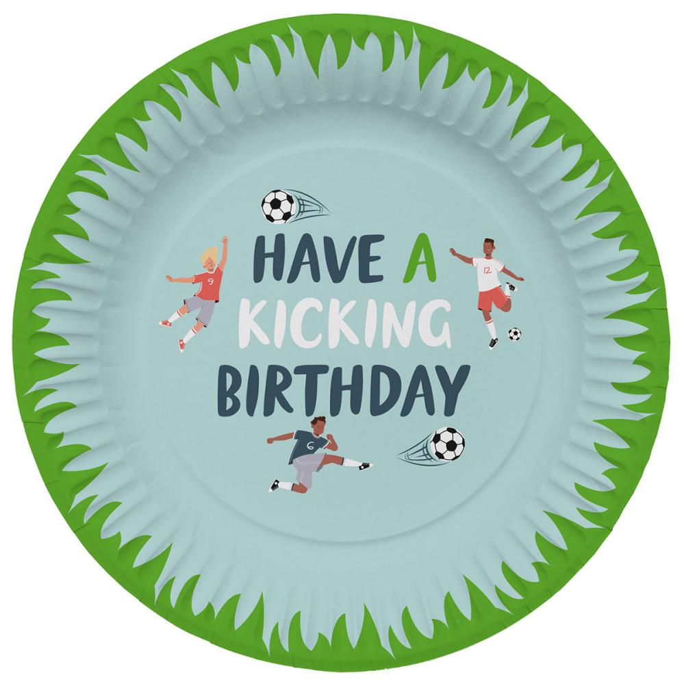 Papperstallrikar Fotbollskalas 8-pack består av åtta salviagröna engångstallrikar med motiv av grönt gräs längs ytterkanten, tre fotbollsspelare samt texten "Have A Kicking Birthday".