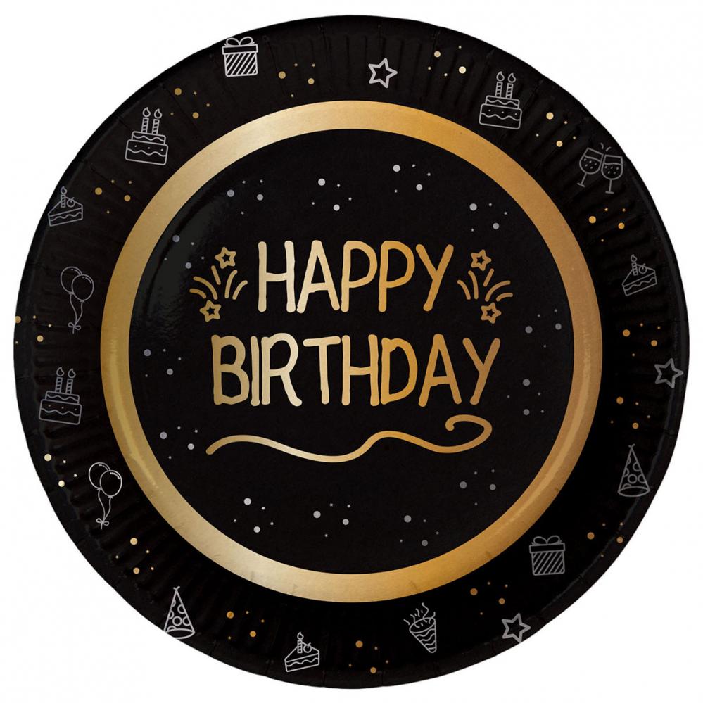 Papperstallrikar Happy Birthday Svart 8-pack består av åtta engångstallrikar, dekorerade med texten "Happy Birthday", stjärnor och prickar i guldfärg samt tårtor, stjärnor, partyhattar och dricksglas i silverfärg mot en svart bakgrund.