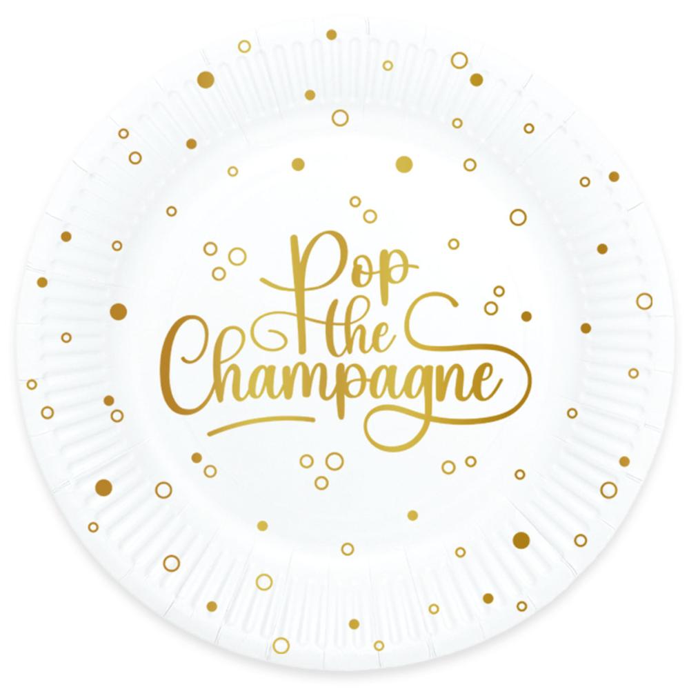 Papperstallrikar Pop the Champagne 8-pack består av åtta stycken vita papperstallrikar som har motiv av champagnebubblor och texten "Pop the Champagne" i en dov guldton.