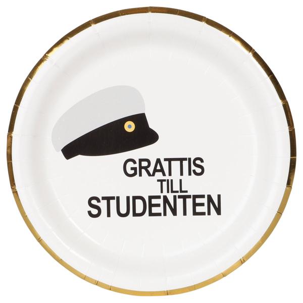 Papperstallrikar Studentmössa 23 cm 8-pack innehåller åtta vita pappersassietter med guldkant och är dekorerade med texten "GRATTIS TILL STUDENTEN" i svart samt en klassisk studentmössa.