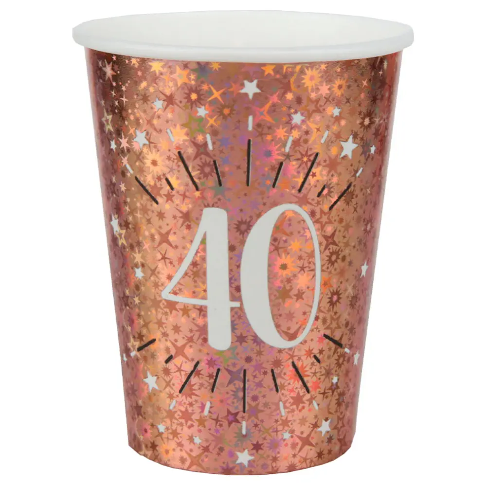 Komplettera 40-års fest-dukningen med dessa snygga pappmuggar! Holografiskt skimrande engångsmuggar i roseguld med dekorativt 40-års motiv som garanterat lyfter hela dukningen. Ett utmärkt val för dig som önskar en roseguldig dukning till nästa 40-års fest.