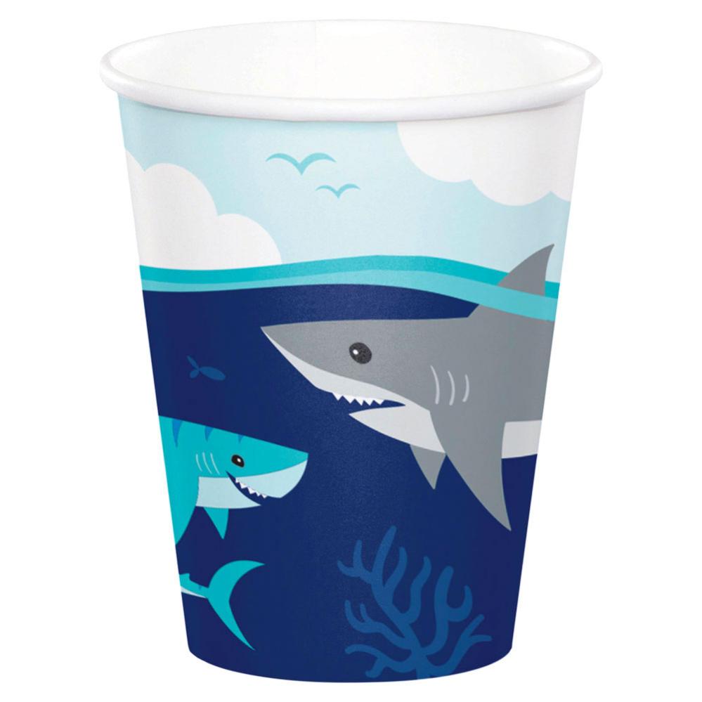 Pappmuggar Shark Party omfattar ett 8-pack engångsmuggar med häftiga hajmotiv. Muggarna är tillverkade av papp och rymmer ca 266 ml.