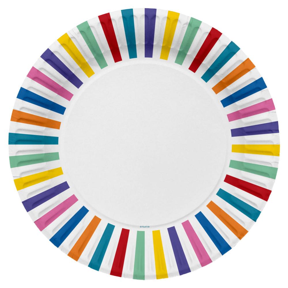 Papptallrikar Stripes Color Pop omfattar 8 st vita engångstallrikar med dekorativa ränder i flera olika färger längst kanten. Tallrikarna är i papp och mäter ca 23 cm i diameter.