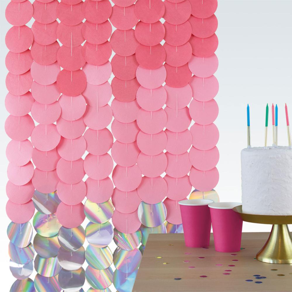 Skapa en iögonfallande partybakgrund med detta rosa och iriserande cirkeldraperi. Perfekt som backdropdekoration eller festdekoration, där du enkelt anpassar de åtta girlanderna efter din egen stil.