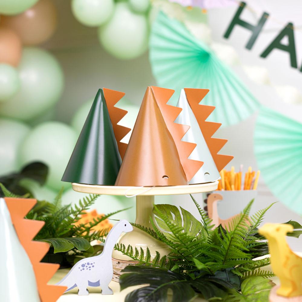 Partyhattar Dinosaurie 3-pack består av tre partyhattar med dinosauriemotiv, där varje modell inkluderar två hattar i brun, grön och mintgrön. Varje hatt är dekorerad med orangea dinosaurie ryggkotor.