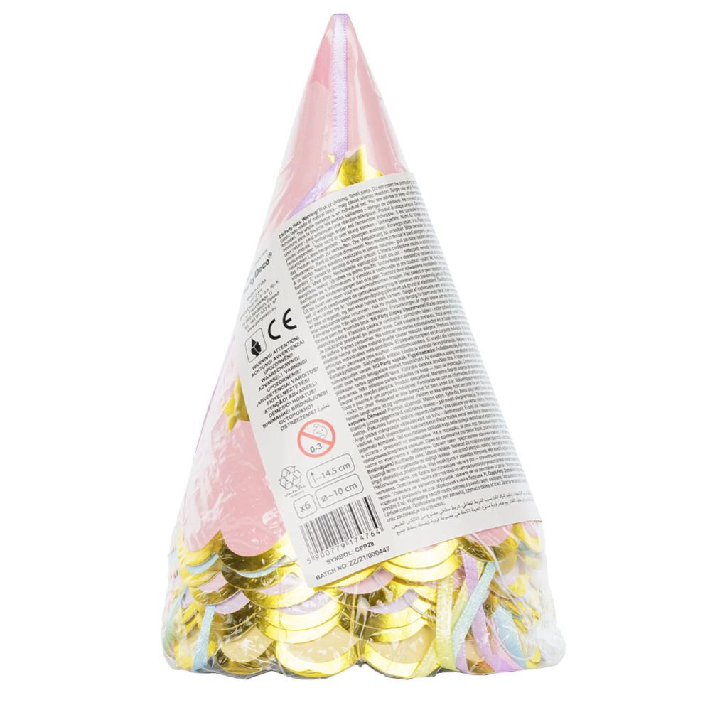 Partyhattar Rosa med Stjärnor omfattar 6 stycken rosa partyhattar med en bågad kant i guld och motiv av stjärnor i rosa, lila och guld. Hattarna har dessutom färgglada band från toppen, och fästs på huvudet med ett elastiskt band under hakan.