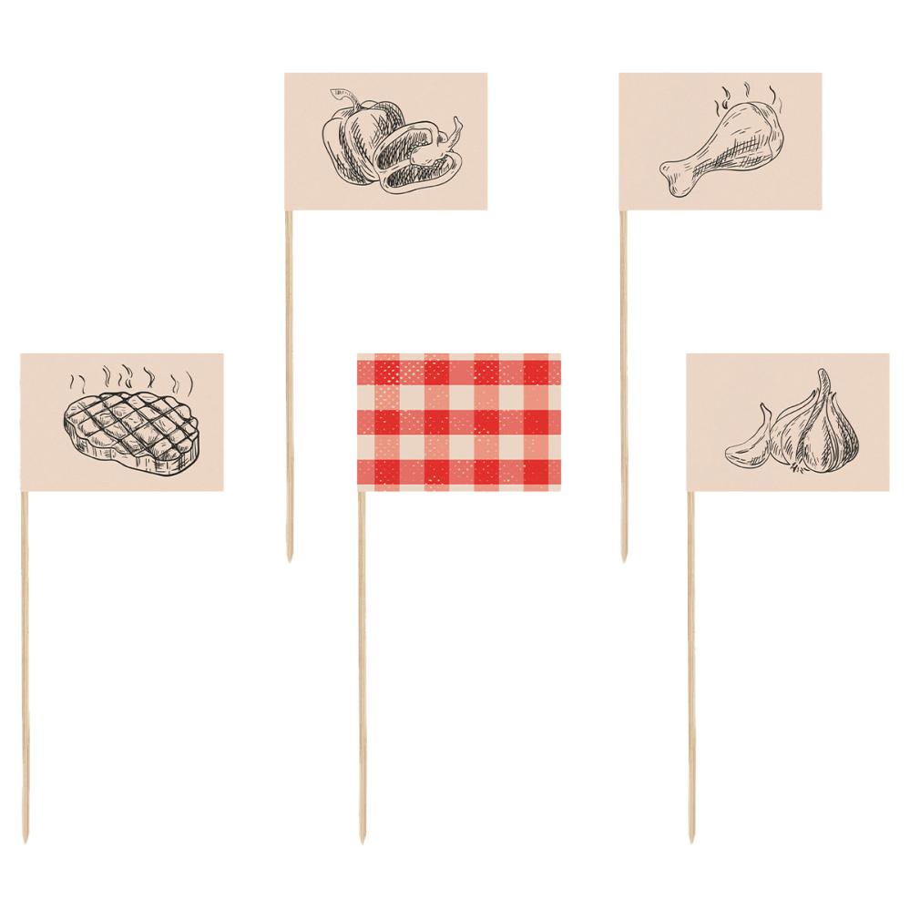 Partypicks med Grilltema 12-pack består av tolv träpinnar med pappersflaggor i fem olika motiv med grilltema, bland annat en kycklingklubba, en grillad paprika och en vitlök.