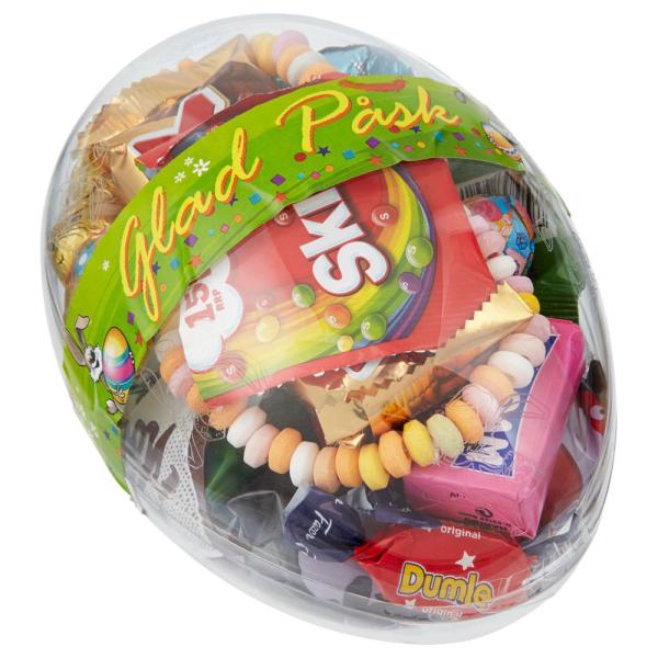 Påskägg med Godis omfattar ett genomskinligt påskägg i plast fylld med Marabou Oreo, Maoam, godishalsband, Dumle, sura skallar, skumgodis mix och diverse olika påskgodisar.