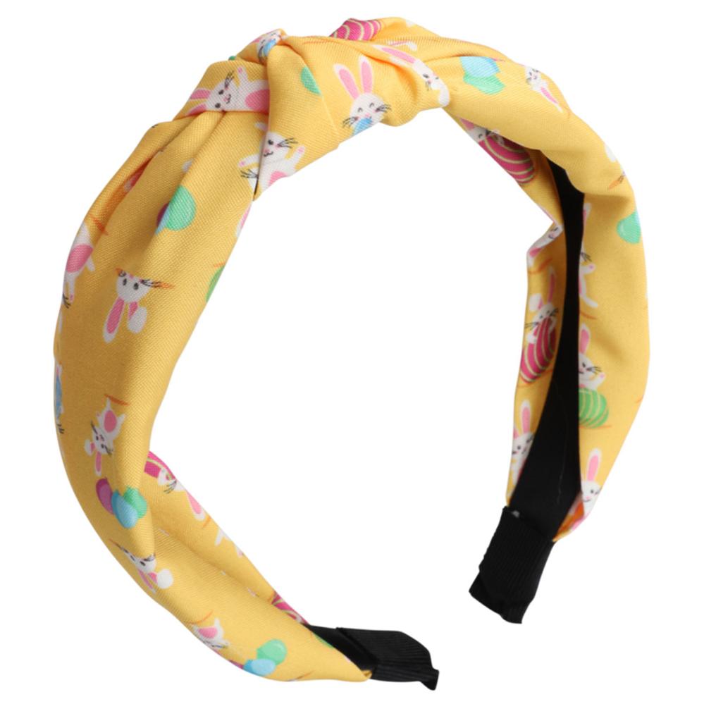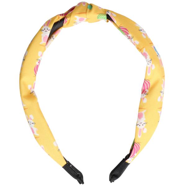 Påskdiadem Kaniner Gul är ett diadem i gult, dekorerat med vita kaniner där vissa håller ett påskägg eller en morot.