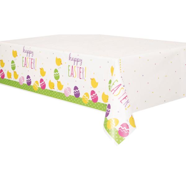 Påskduk Happy Easter innefattar en duk i plast med påskägg och påskkycklingar samt meningen "Happy Easter" på.