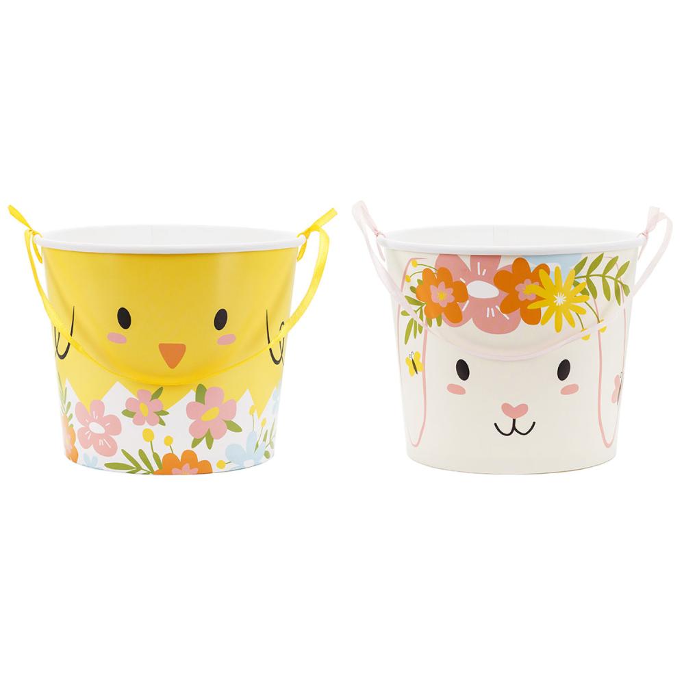 Påskhink med Handtag 17x14 cm 2-pack består av två påskhinkar, en vit med rosa satinband och en gul med matchande satinband, dekorerade med olika djurmotiv och blommor.