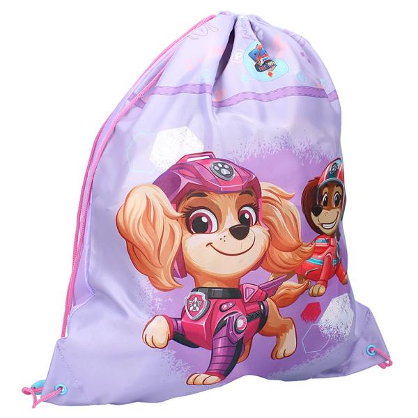 Paw Patrol Girl Pup Power Gympapåse omfattar en ljuslila gympapåse för barn med Paw Patrol Girl Pup Power motiv i form av två hundar med dräkter och hjälm i olika färger från Paw Patrol filmen. Gympapåsen är ca 44 cm hög och 37 cm bred och har två axelband i ljusrosa som även används för att öppna och stänga påsen.