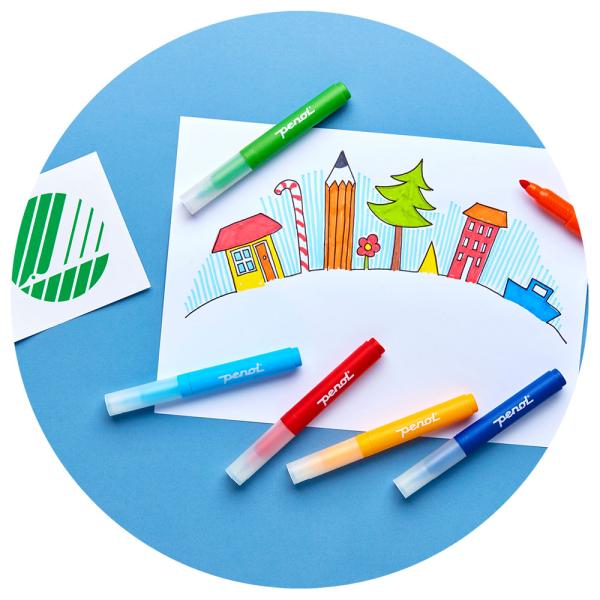 Penol Jumbo Tuschpennor 10-Pack omfattar tio extra stora filtpennor med en bred fiberspets som går mellan 2-4 mm. Pennorna är tillverkade av 100% återvunnet plast med ett ventilerat lock och vattenbaserat tvättbart bläck.
