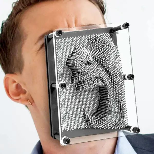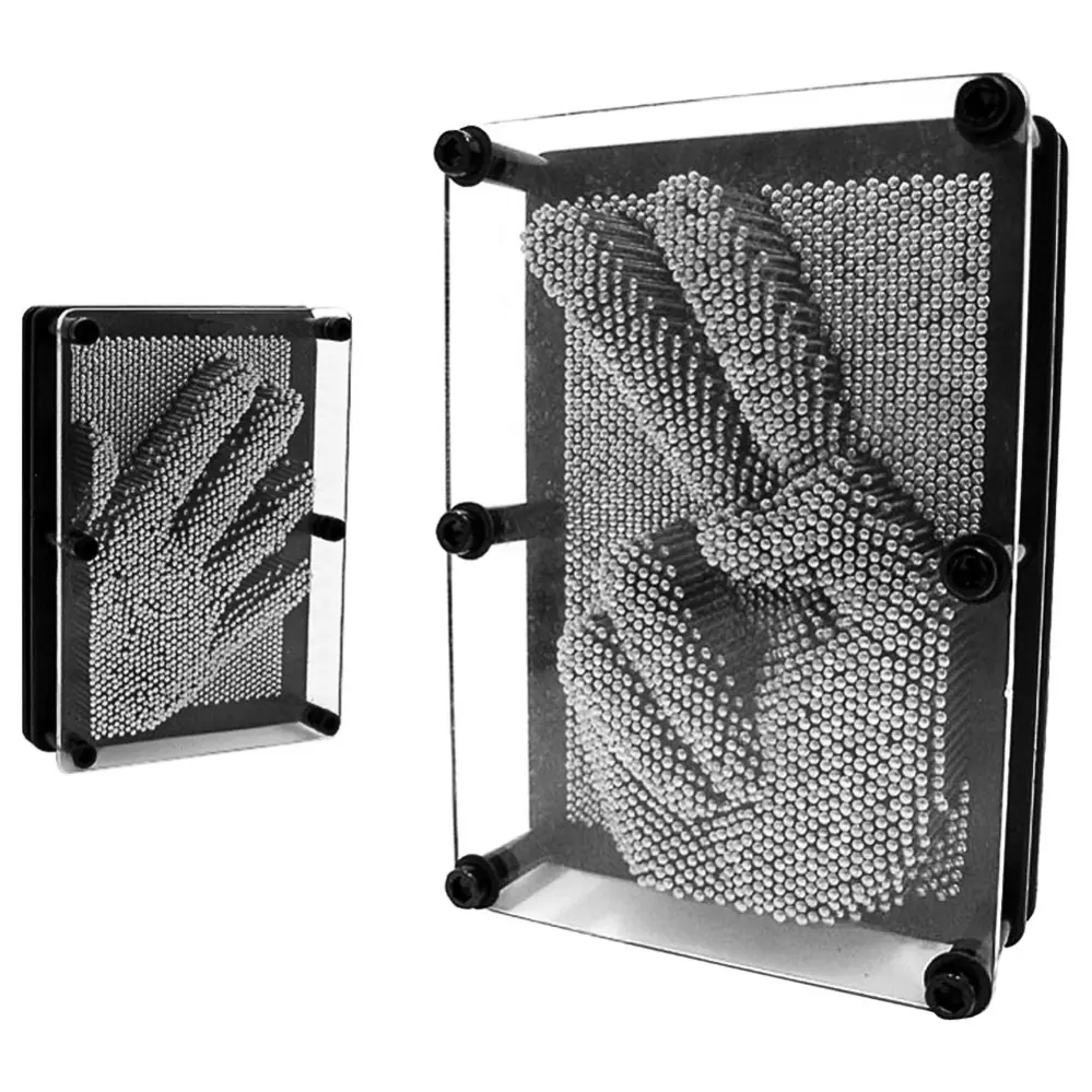 Pin Art XL omfattar en platta i ABS-plast med metallstift, som vid beröring bildar tillfälliga konstverk i 3D. Plattan är ca 20 cm lång och ca 15 cm bred.