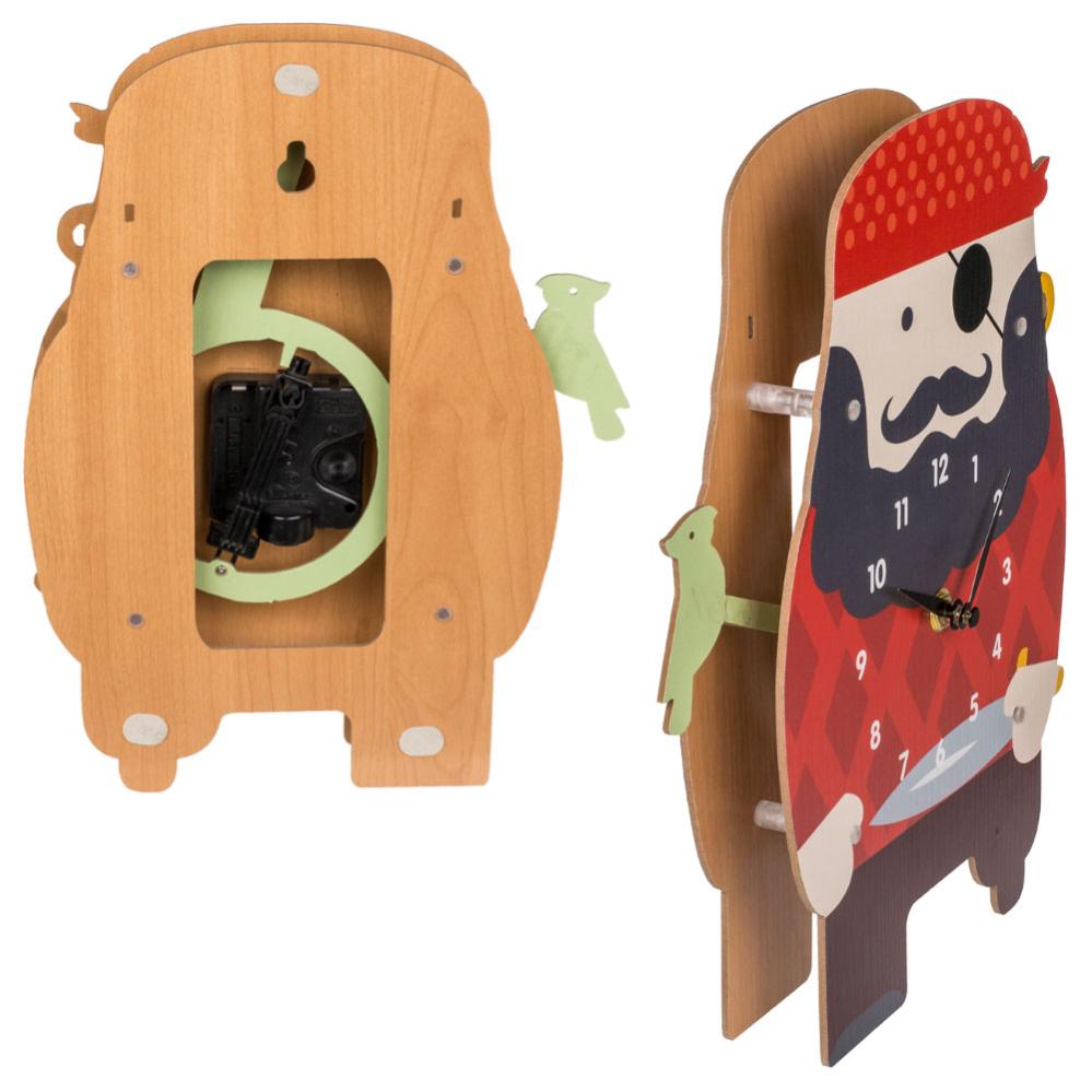 Pirat Väggklocka består av en analog väggklocka i trä föreställande en rödklädd sjörövare med ögonlapp och en papegoja som kan röra sig upp och ner. Klockan drivs av ett AA-batteri.