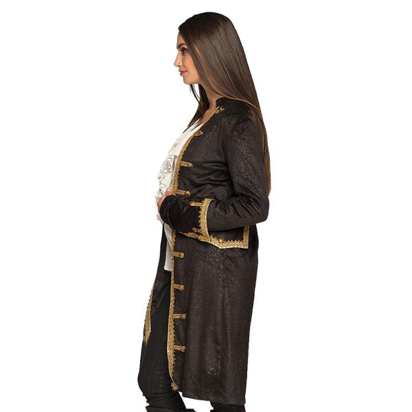 Piratjacka Dam omfattar en lång svart jacka med guldiga detaljer och guldknappar i piratstil. Jackan är tillverkad i polyester och passar vuxna.