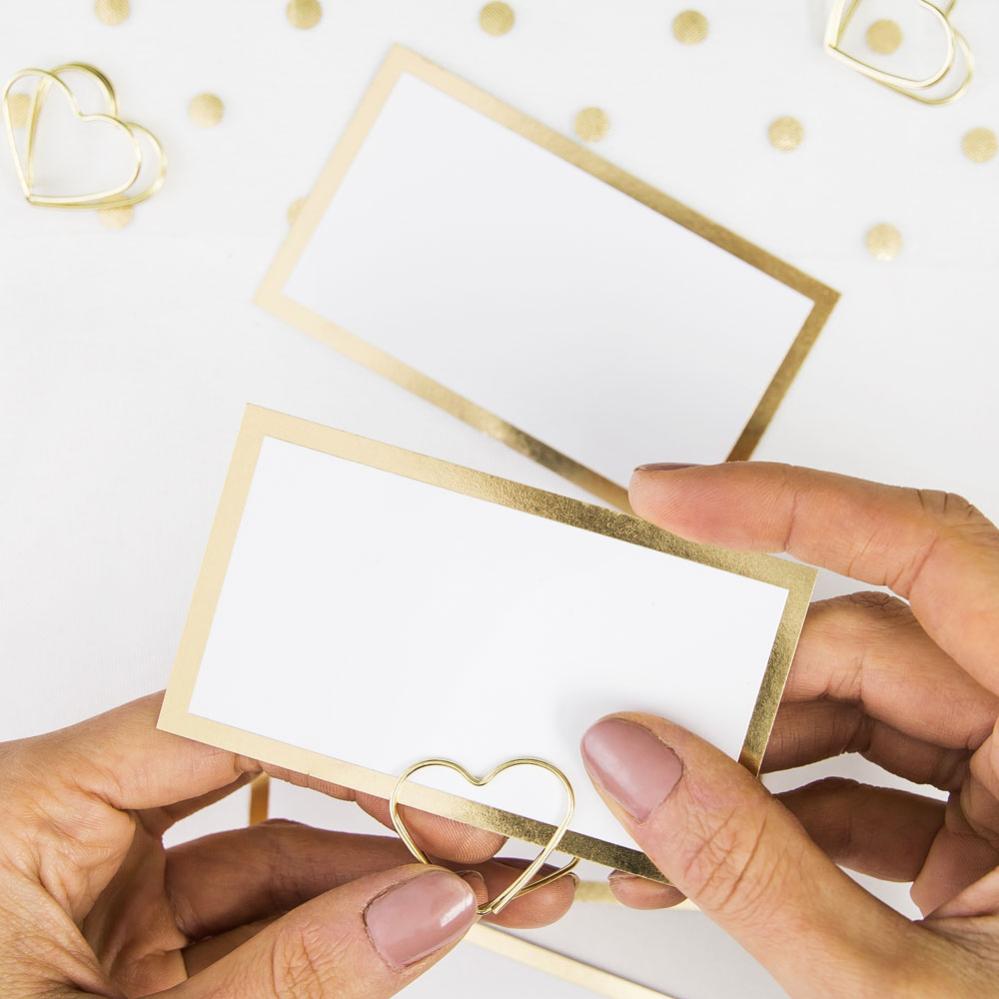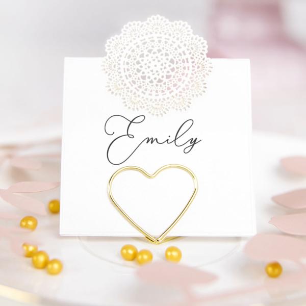 Duka fram placeringskorten på ett enkelt och framför allt riktigt snyggt sätt med dessa fina placeringskorthållare. Dekorativa hållare i form av guldiga hjärtan som snyggt håller dina placeringsort på plats. Ett riktigt fint dukningstillbehör till förslagsvis bröllopsdukningar i guld.