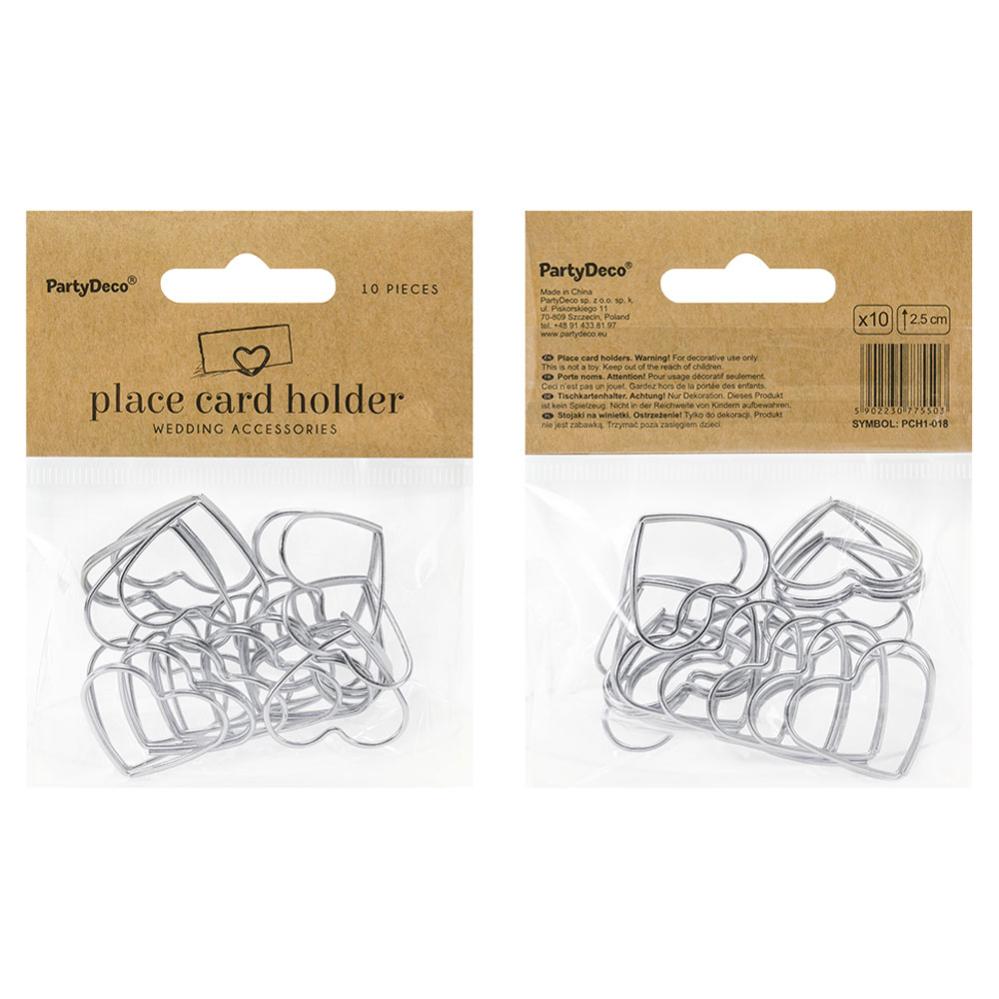 Placeringskorthållare Hjärtan Silver omfattar ett 10-pack silvriga placeringskorthållare i form av hjärtan. Hållarna är tillverkade av metall och är ca 3 cm breda samt 2,5 cm höga.