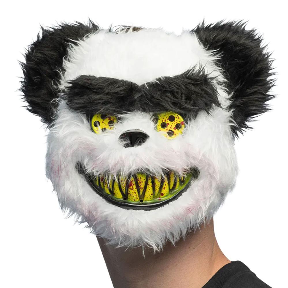 Plysch Mask Läskig Panda är en fluffig mask av fuskpäls som föreställer en pandas ansikte i vitt och svart med rosa detaljer samt limegröna och limegula ögon och tänder. Masken har hål för ögon, näsa och mun, en mjuk skumkudde vid pannan och ett svart elastiskt band som håller den på plats.