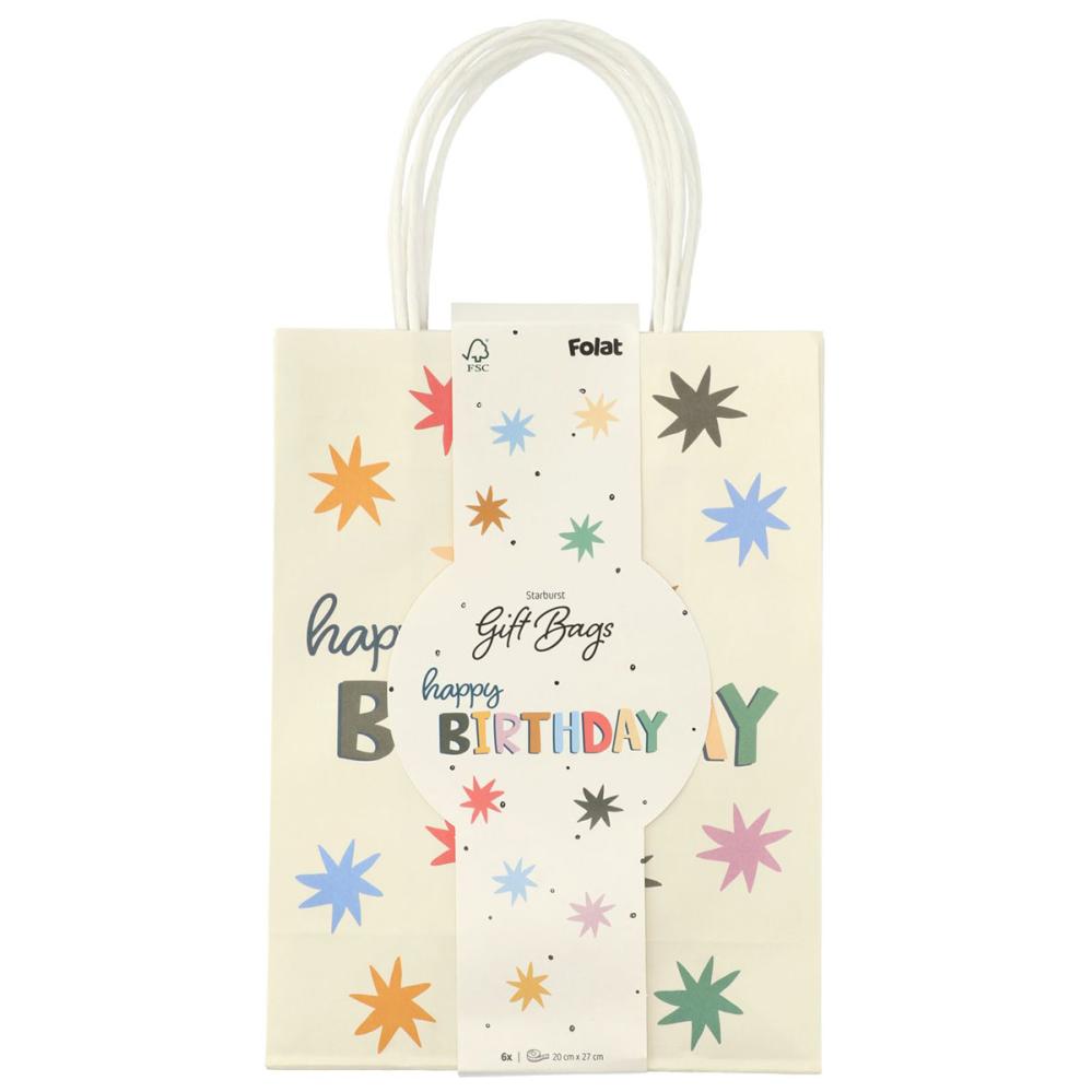 Presentpåsar Happy Birthday 6-pack består av sex vita presentpåsar med handtag, dekorerade med texten "Happy Birthday" och stjärnor i svart, blått, grönt, orange, rött, brunt och rosa.