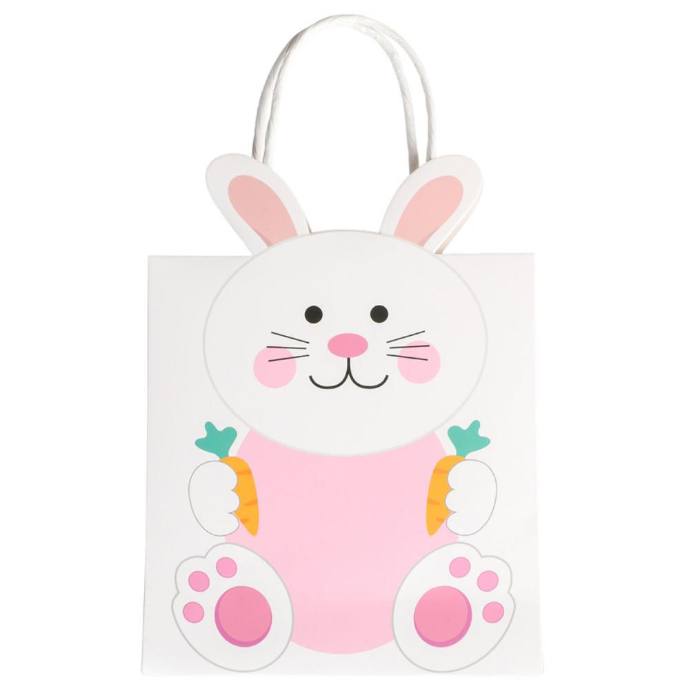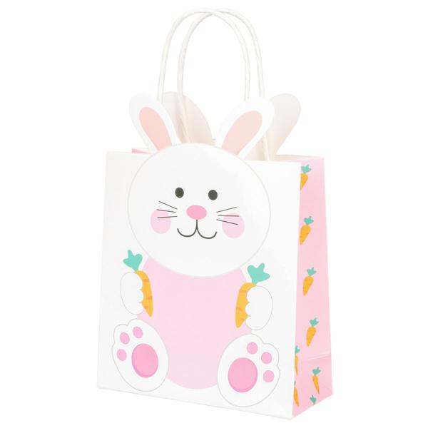 Presentpåse Kanin Vit 12x6x15 cm är en presentpåse med motiv av en vit och rosa kanin som håller två morötter. Påsen har uppstickande kaninöron, rosa sidor med morötter och vita bärhandtag.