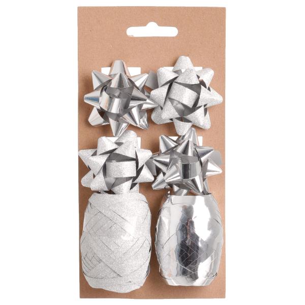 Presentsnöre & Rosett Kit Silver omfattar ett silverfärgat presentinslagningsset med ett skimrande presentsnöre, ett presentsnöre med glitter, två skimrande presentrosetter och två presentrosetter med glitter.